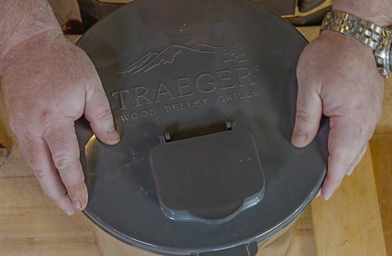 Traeger pellet storage lid and filter kit combined with the traeger metal storage bucket makes for convenient storage of traeger wood pellets.
